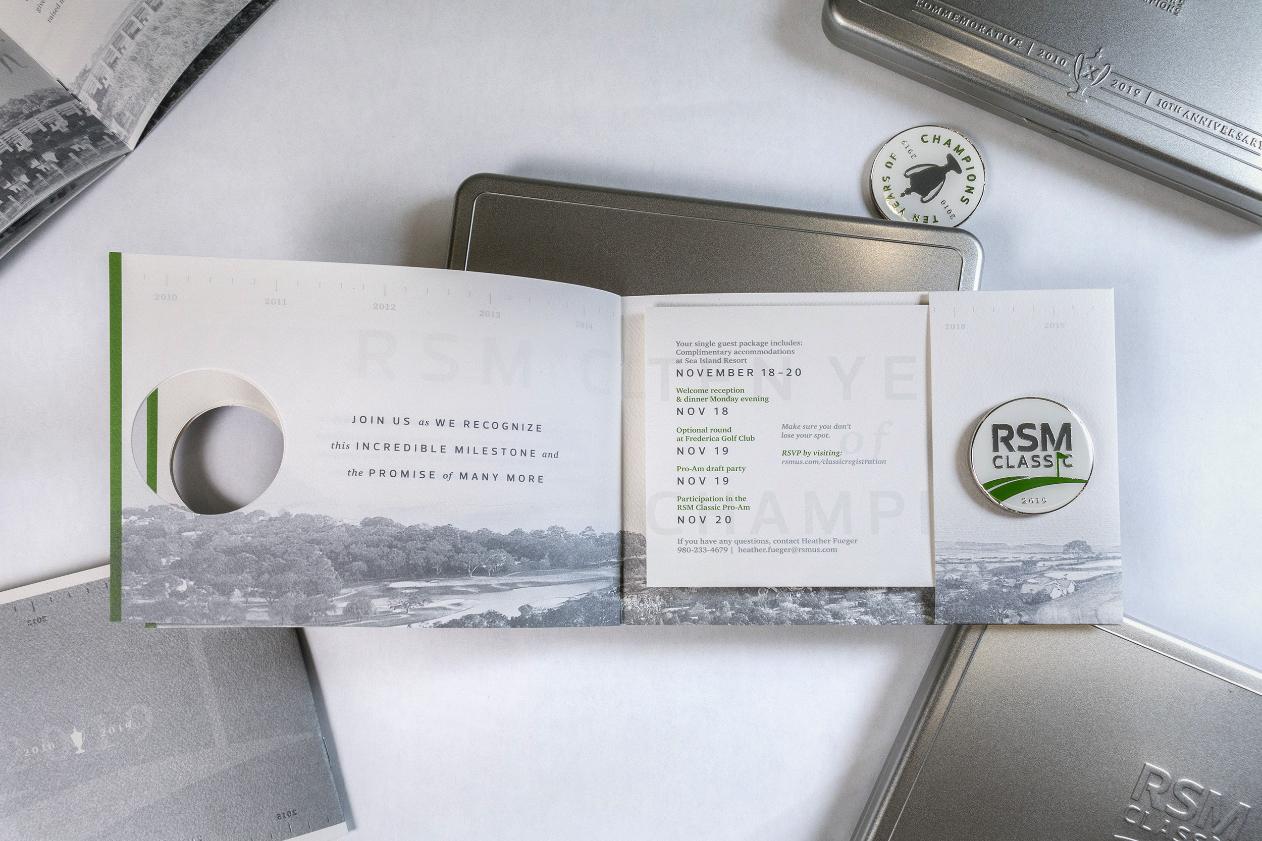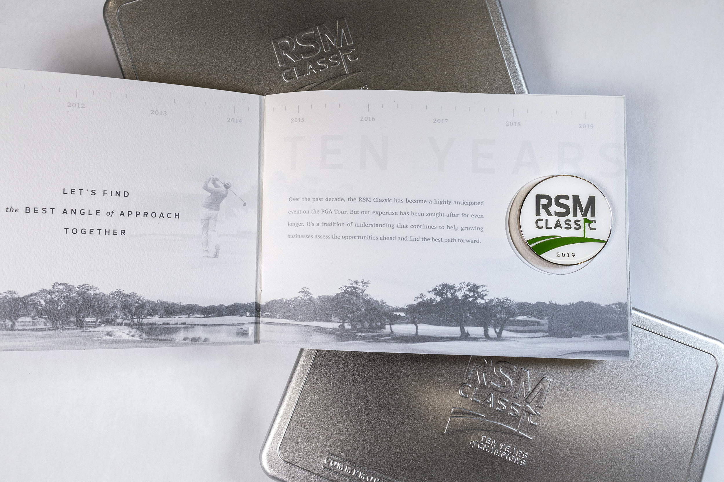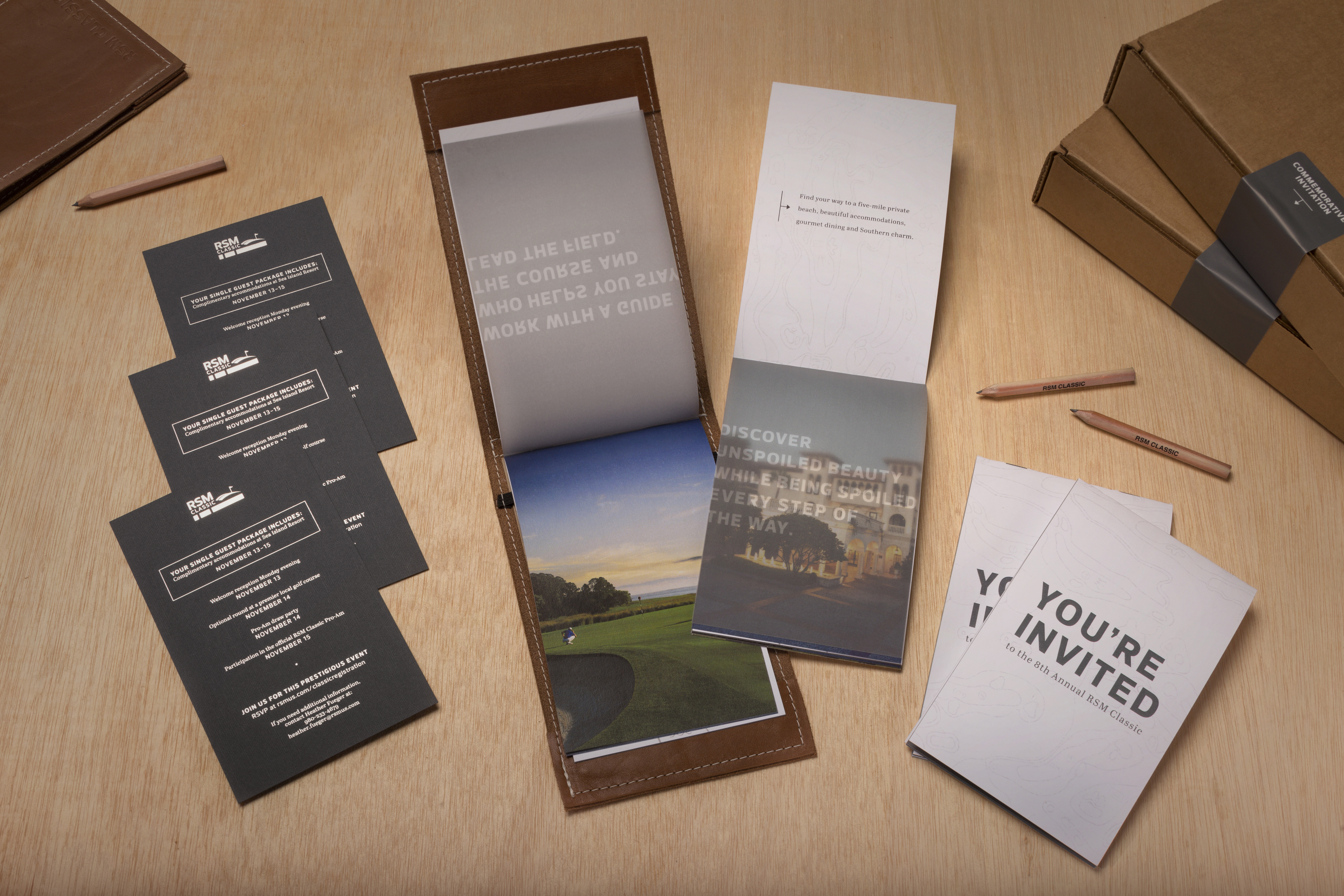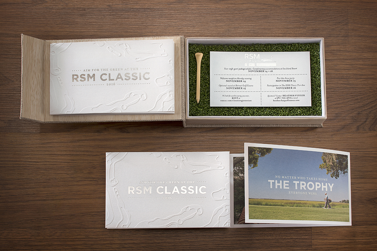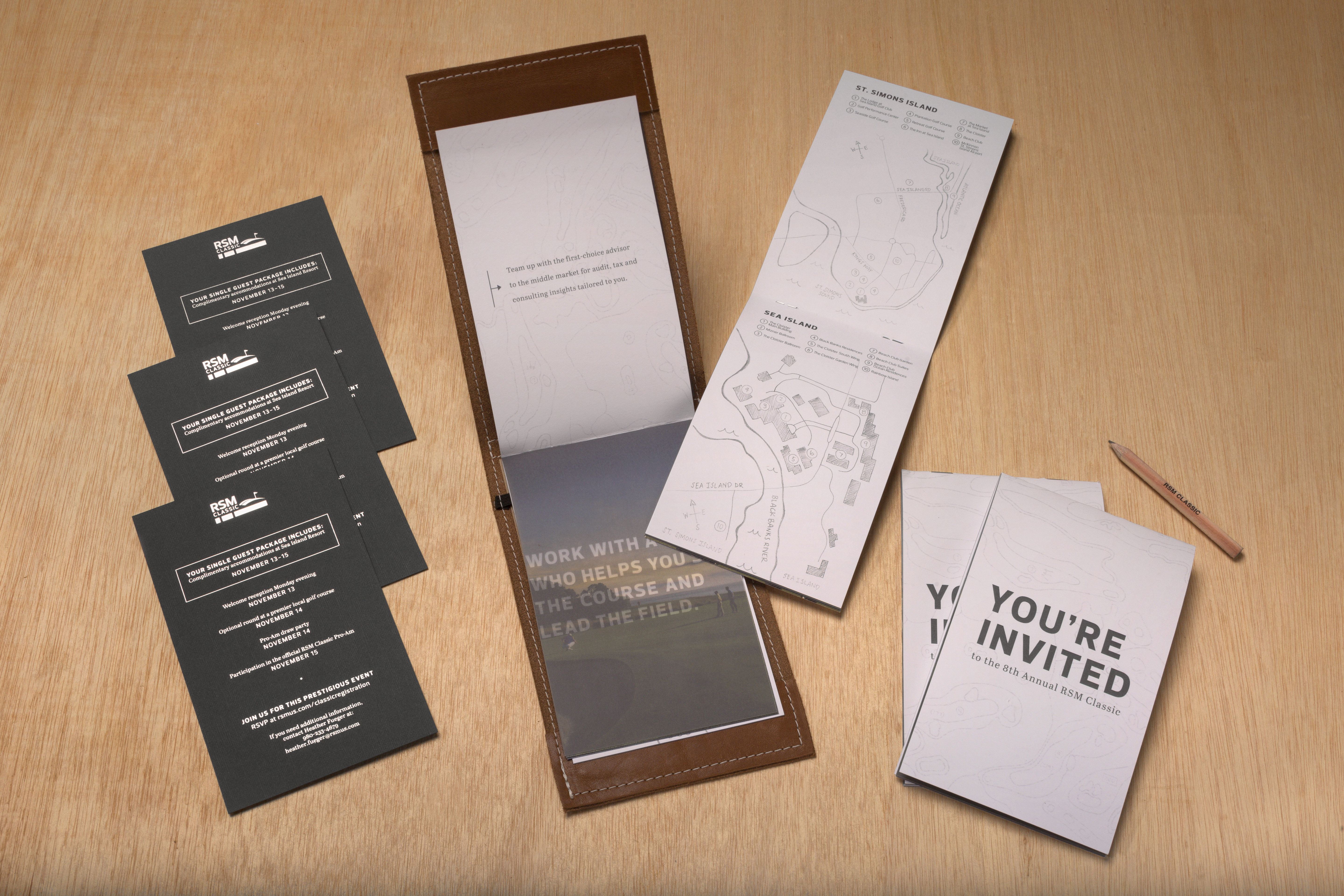 The RSM Classic is an official PGA TOUR event in Sea Island, Georgia. These upscale invitations were sent over several years inviting potential and current RSM clients to the event.